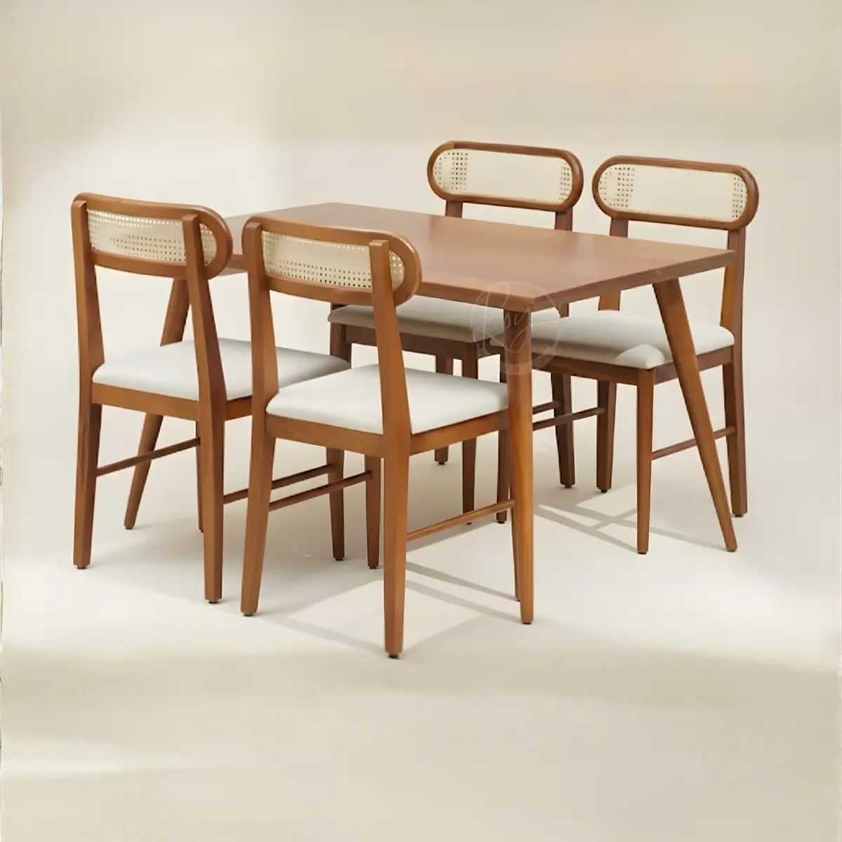 What makes this teak wooden cane dining set special is its thoughtful complete ensemble approach. The four matching chairs feature distinctive rounded cane-panel backrests providing breathable comfortable back support—the organic cane texture adds warmth while the rounded frames create soft welcoming aesthetic. The cushioned seats offer genuine comfort for extended dining and conversation. The tapered legs on both chairs and table create classic mid-century profile. The brass leg caps add sophisticated finishing detail protecting floors while providing elegant accent. The rectangular table provides generous dining surface accommodating family meals and entertaining comfortably. Every element reflects furniture philosophy where beauty, comfort, and practicality unite seamlessly.