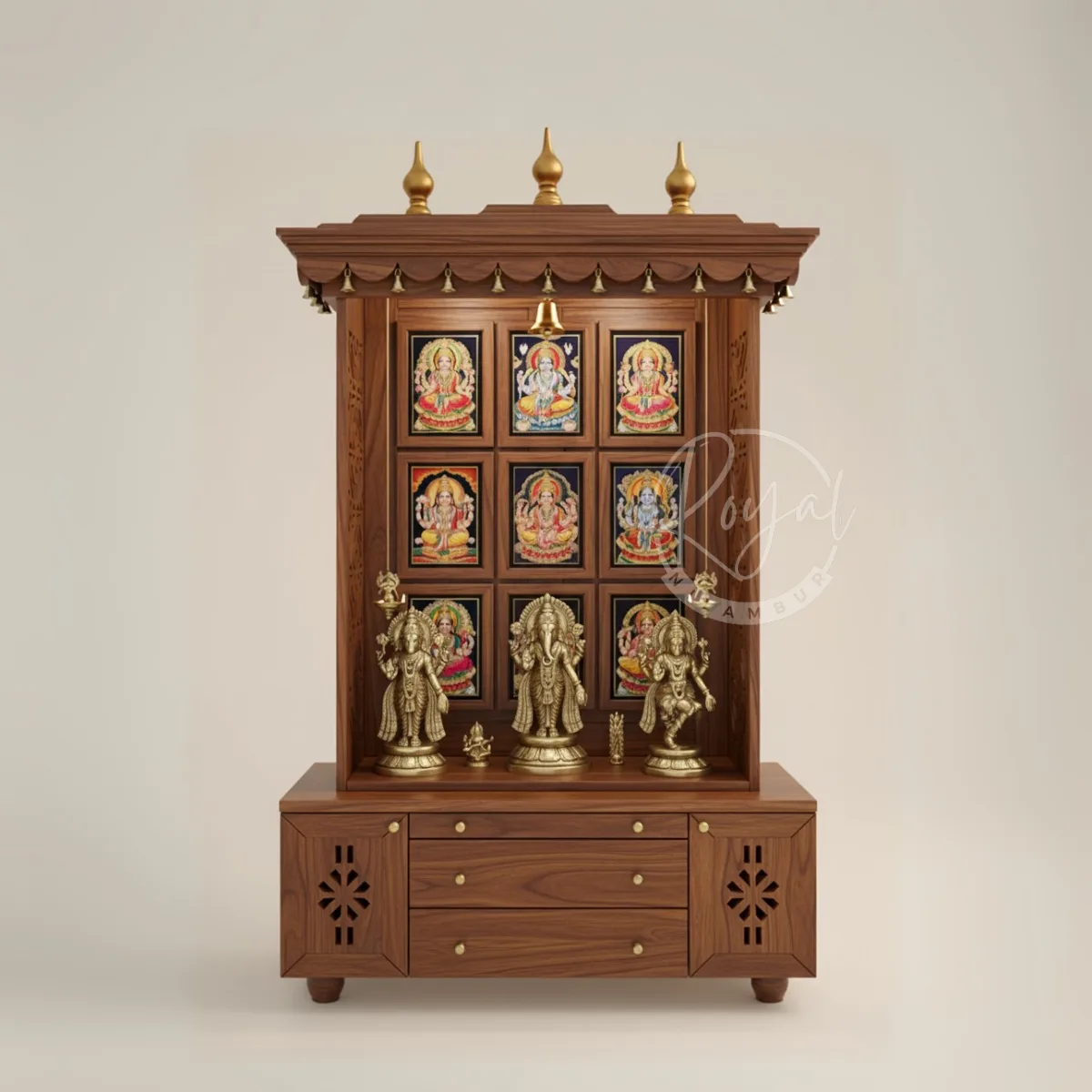 Three Deep Drawers: Store vastras, prasad, and essential pooja items. Solid brass knobs add elegance.