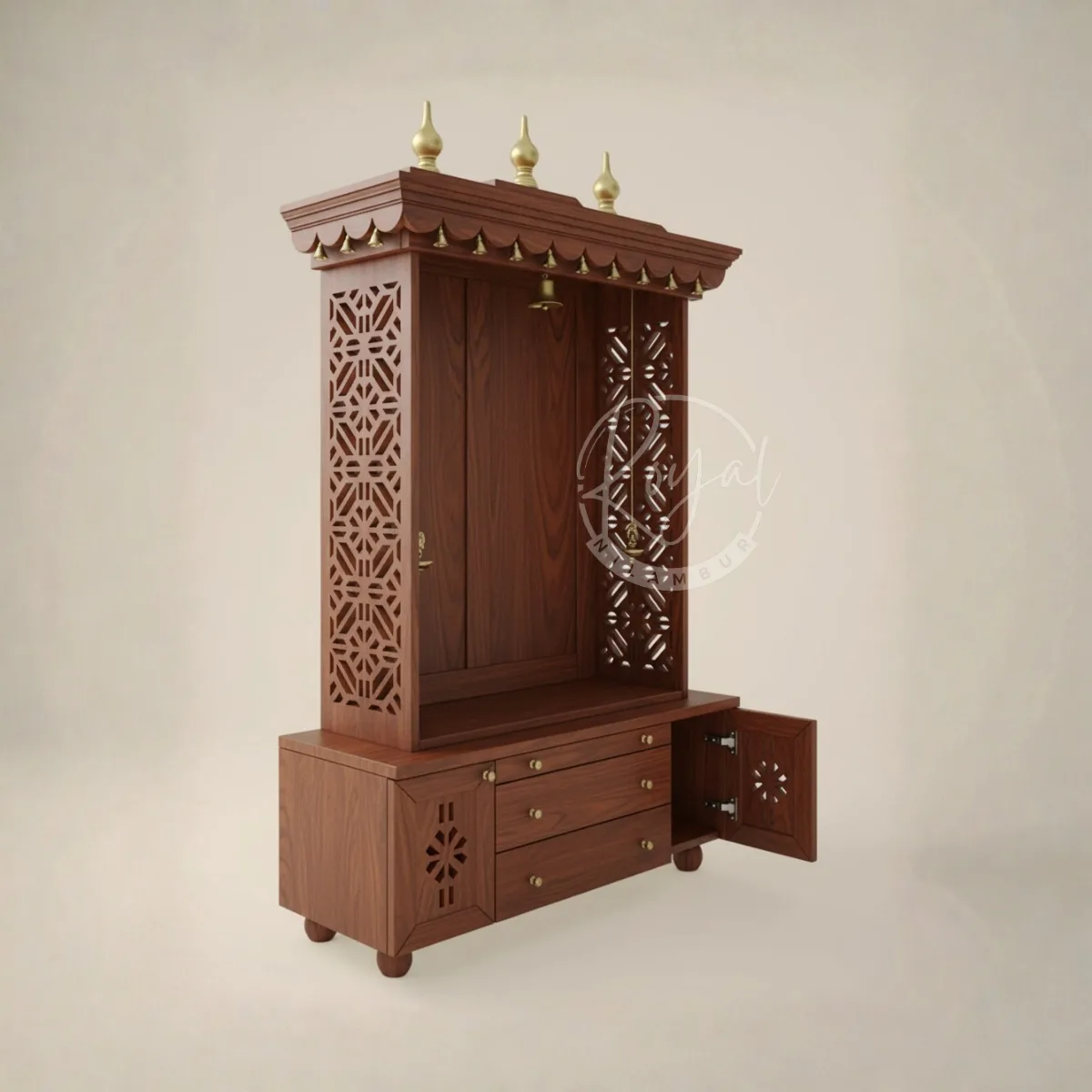 Two Side Cabinets with Jali Cutouts: Decorative latticework allows safe storage for diyas, incense, and ceremonial books while ensuring ventilation.