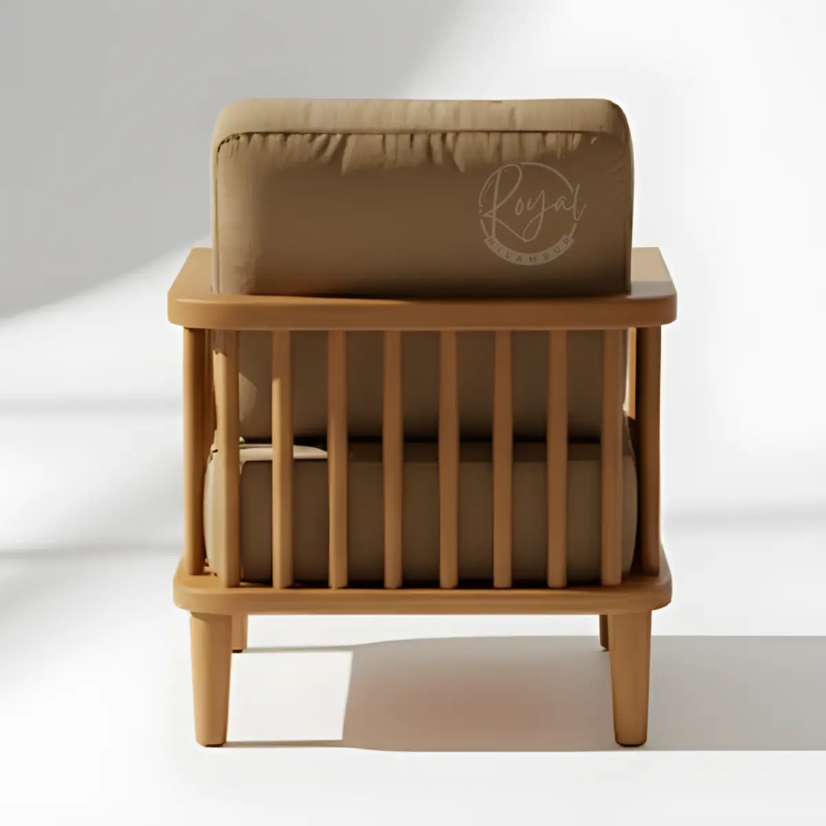 Every element of the Royal Elvorn wooden sofa set has been thoughtfully designed to deliver both visual impact and exceptional comfort. The three-seater sofa and matching armchairs feature distinctive vertical slat armrests—a design choice that creates an open, contemporary feel while maintaining structural integrity. These handcrafted slats showcase the precision joinery that Royal Nilambur's master artisans are known for, with each piece fitting seamlessly to create smooth, flowing lines.