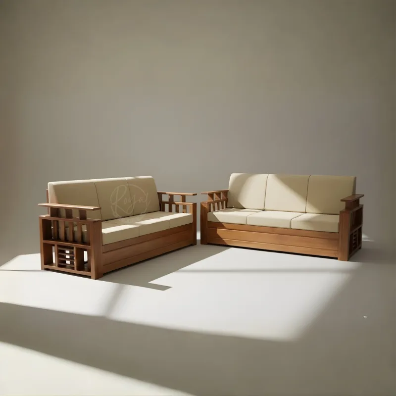 Every element of the Royal Navrix Sofa Set reflects thoughtful design and expert craftsmanship. Its solid teak frame showcases refined proportions, precise joinery, and smooth, hand-polished surfaces. The golden-brown teak contrasts beautifully with the soft, neutral-toned cushions, creating an inviting yet sophisticated look. The handcrafted edges and graceful curves celebrate traditional Indian artistry while fitting perfectly into modern interiors.