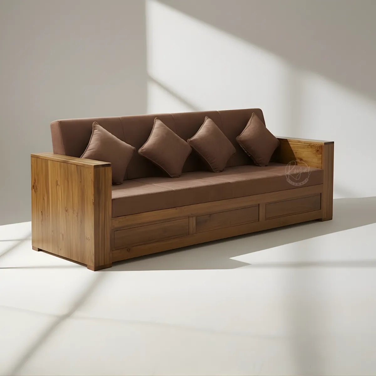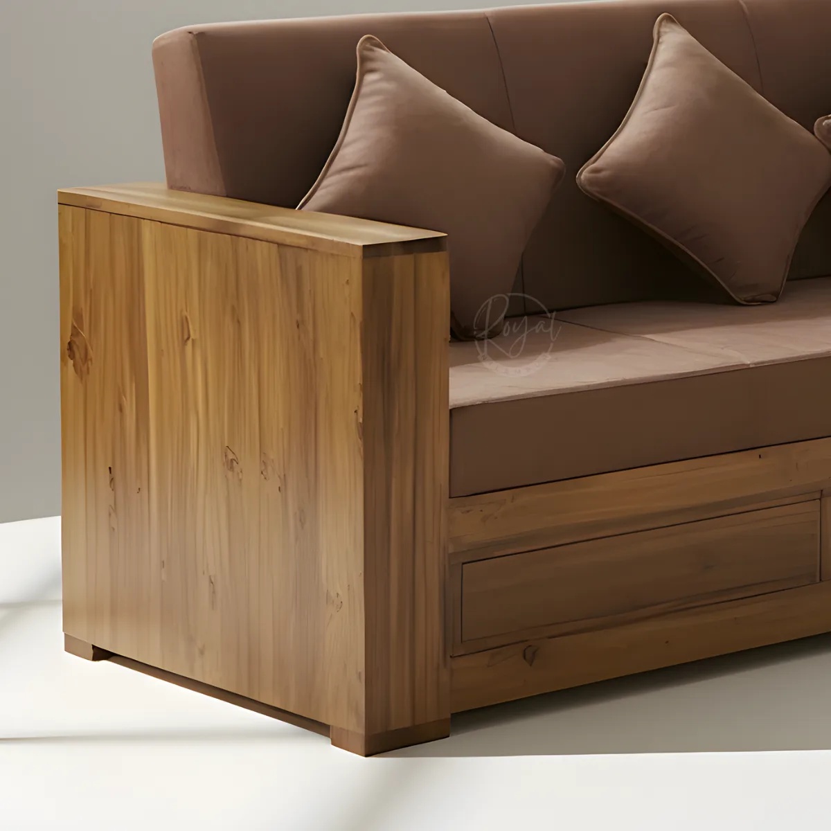 Every curve, edge, and joint of the Navrix Sofa Set reflects meticulous craftsmanship and attention to detail. The ergonomically designed backrest and armrests ensure comfort, while the soft, premium fabric upholstery complements the teak frame beautifully. The smooth polish enhances the golden-brown hue of the wood, ensuring that the sofa ages gracefully over time.