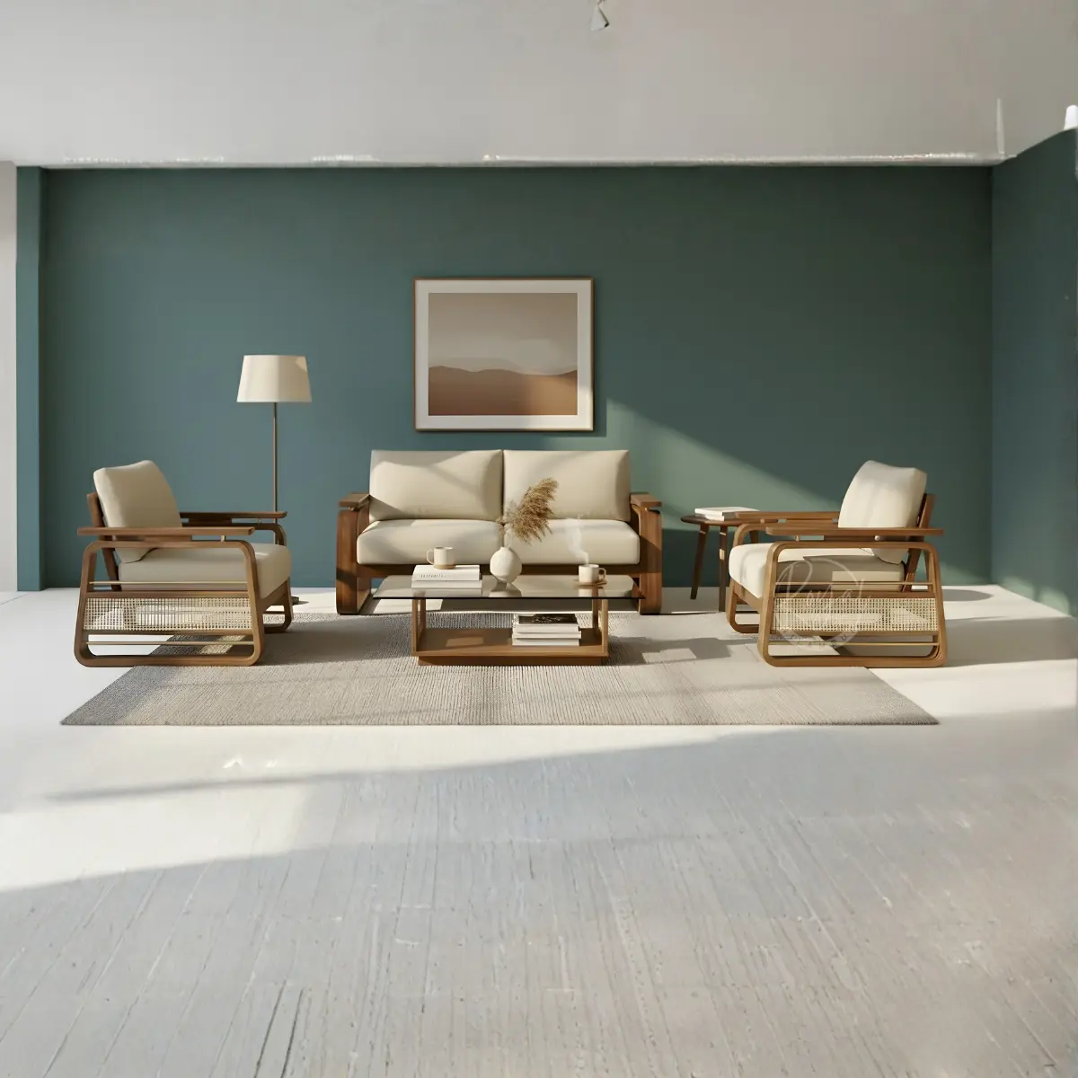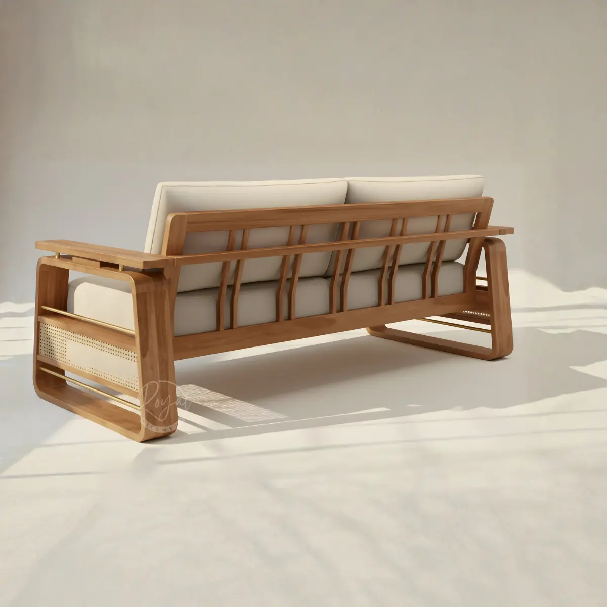 This teak wooden cane sofa set succeeds through thoughtful integration of premium materials creating cohesive design harmony. Traditional sofas prioritize either comfort or aesthetics—often compromising one for the other. This set achieves both through intelligent design where curved teak armrests provide structural beauty and ergonomic support, hand-woven cane panels add organic texture and visual lightness, generous cushions deliver exceptional comfort, and elevated construction showcases craftsmanship from every viewing angle. The three-piece configuration provides versatile seating capacity while maintaining elegant proportions. This teak wooden cane sofa set demonstrates how master craftsmanship can unite beauty and functionality seamlessly.