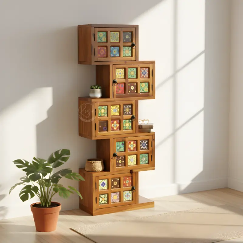 Finding storage furniture that handles different needs often means buying multiple pieces that don't coordinate. The Royal Dhrayen wooden book shelf solves this by delivering comprehensive storage variety in one beautifully designed piece. Handcrafted by Royal Nilambur from authentic Nilambur Wild Teak, this multi-functional cabinet provides protected display, open access, and concealed storage—everything you need in cohesive design.