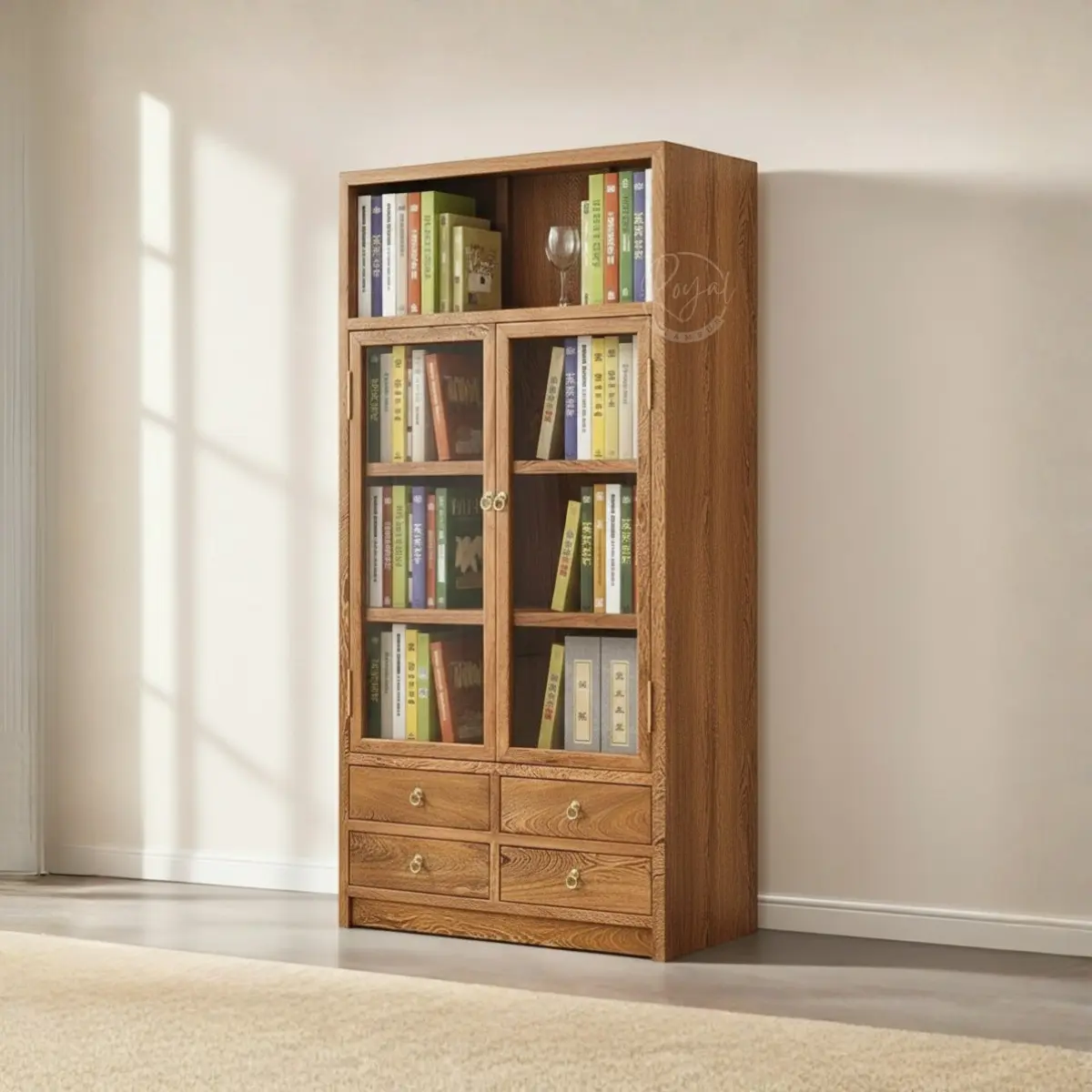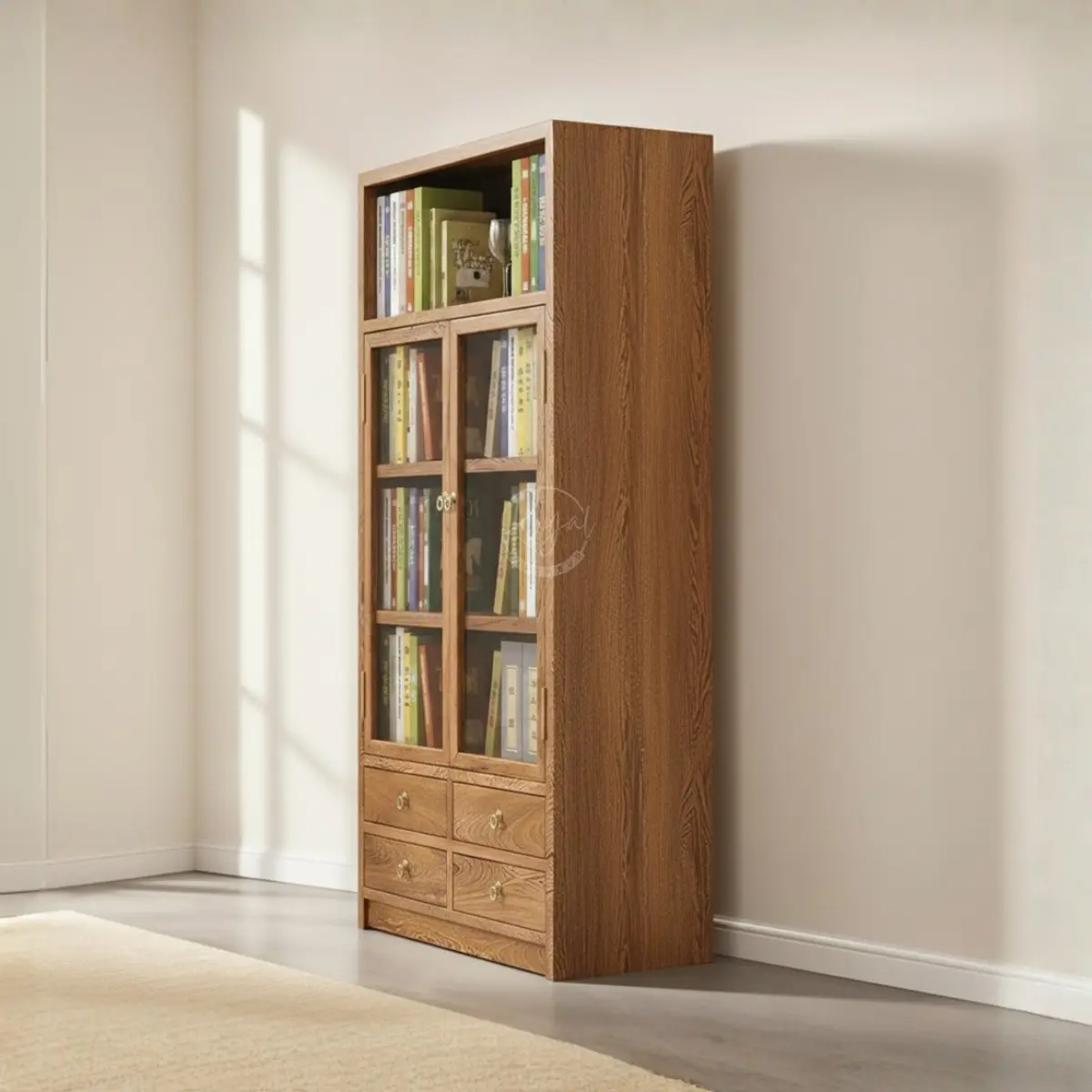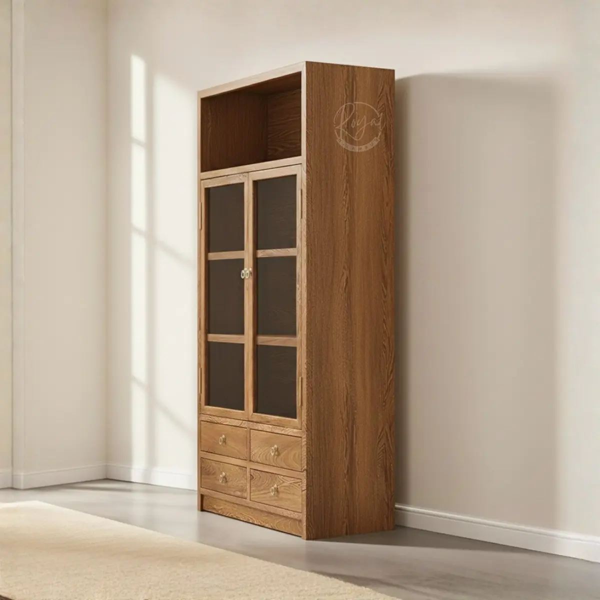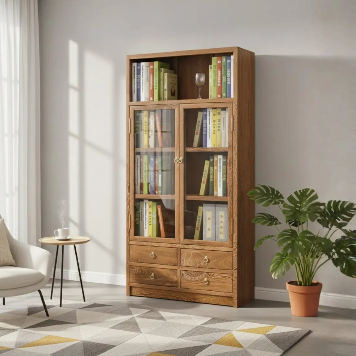 What makes this wooden book shelf special is the multi-zone approach. The glass-door upper section keeps books and collectibles dust-free while visible. The open middle shelf provides quick access to items you use daily—current reads, decorative objects, or frequently needed supplies. The four drawers below offer generous concealed storage for items you want organized but not displayed. This variety means one piece of furniture handles diverse storage needs.