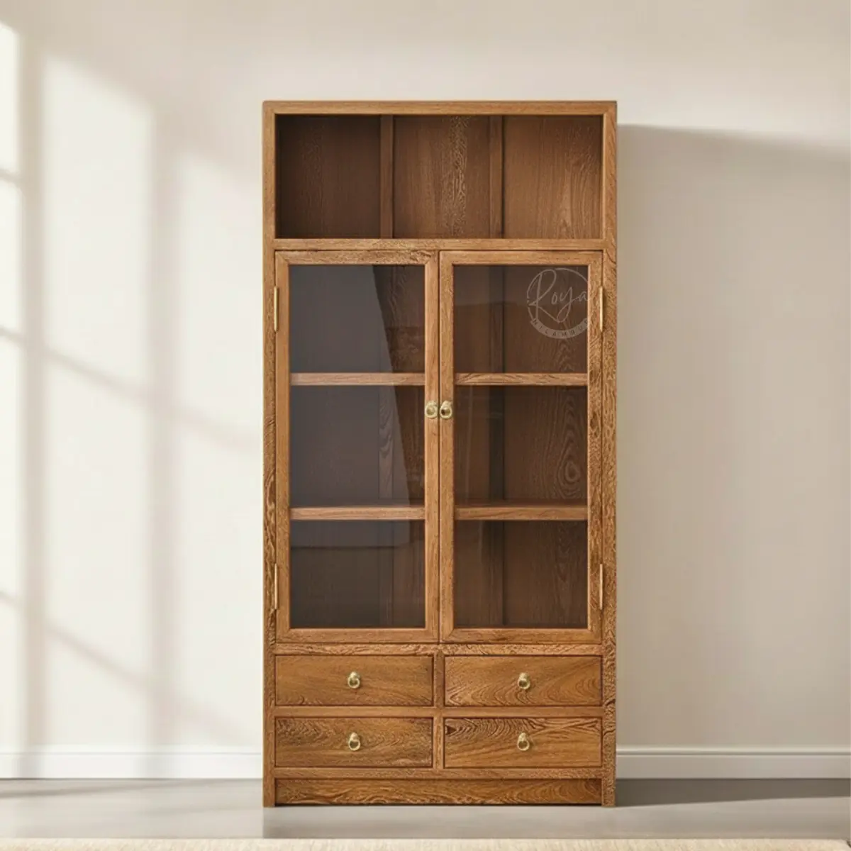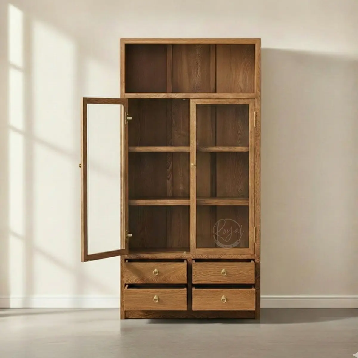 Wooden book shelf that delivers complete storage versatility—meet the Royal Dhrayen. This comprehensive wooden book shelf features glass-door display storage, an open middle shelf for easy access, and four practical drawers below. Handcrafted from authentic Nilambur teak with beautiful visible grain, this multi-functional cabinet brings organized elegance to living rooms, studies, or bedrooms seeking furniture that handles diverse storage needs beautifully.