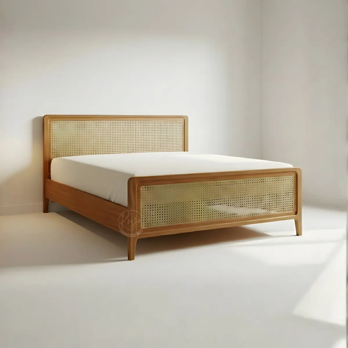 Wooden cane cot that defines bedroom elegance—introducing the Royal Canroy. This contemporary wooden cane cot features hand-woven cane headboard and footboard panels, solid teak frame with rounded corners, tapered legs, low-profile platform design, and premium construction. Crafted from high-quality teak showcasing rich golden honey tones and beautiful grain patterns. Perfect for modern bedrooms seeking furniture combining natural breathability with timeless mid-century design and artisan cane craftsmanship creating serene sleeping environments.