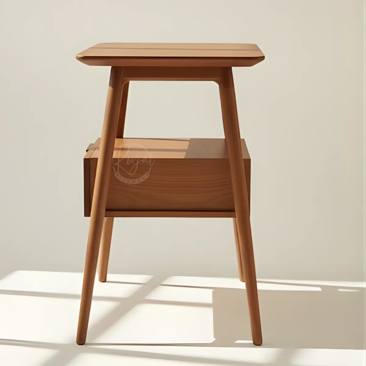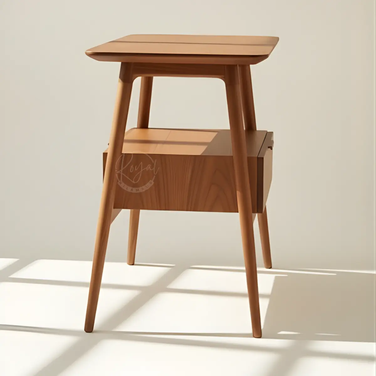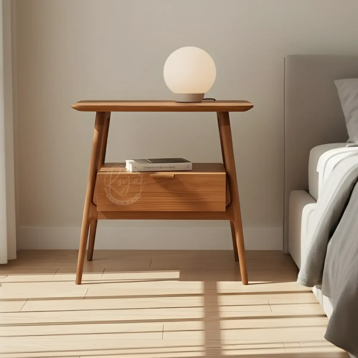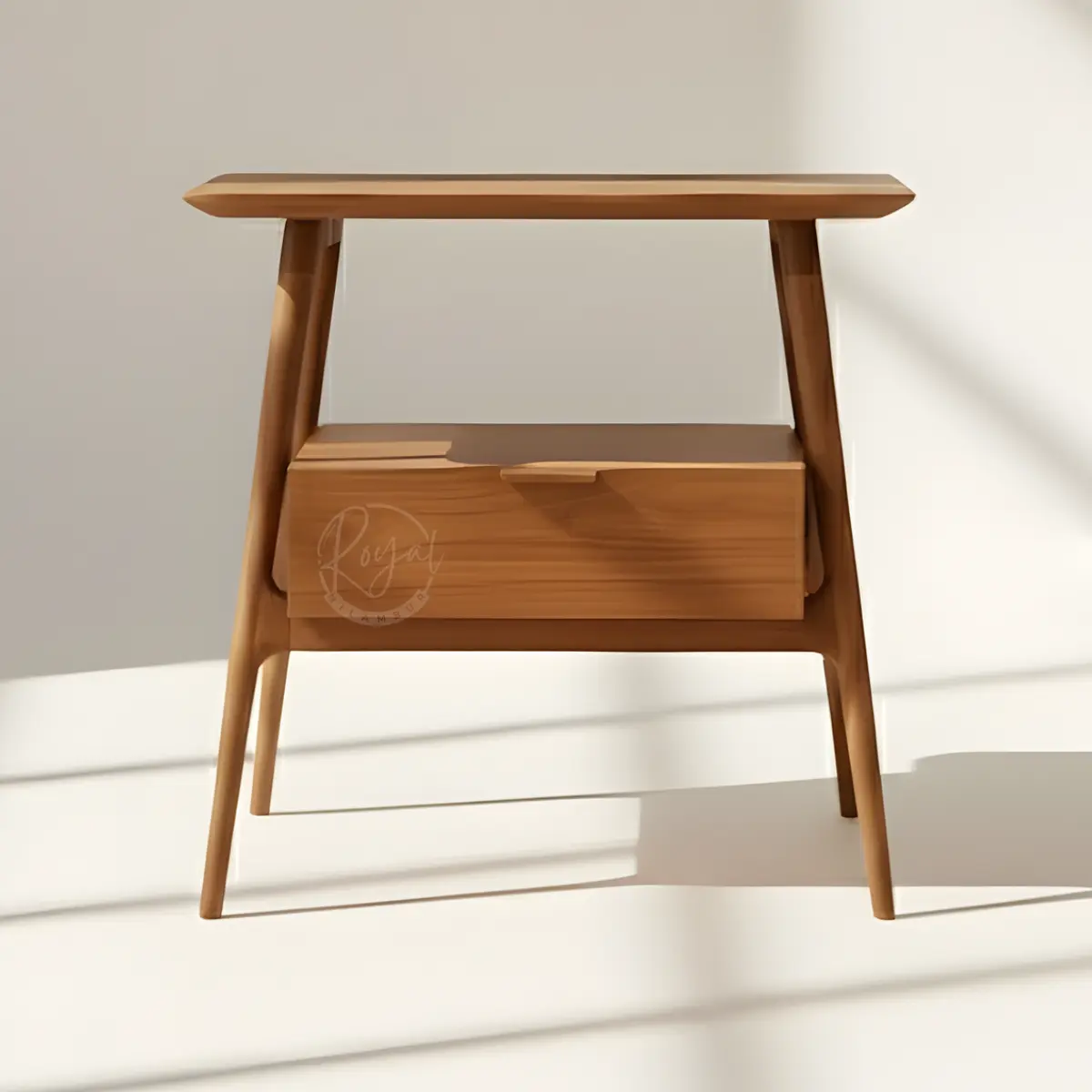 Wooden cot box that brings elegance to your bedside—meet the Royal Avrix. This sophisticated wooden cot box features clean mid-century lines in authentic Nilambur teak with a practical integrated drawer. The sculptural angled legs and smooth rectangular top create a refined nightstand perfect for modern bedrooms. Handcrafted for those who value beautiful design paired with functional bedside storage.