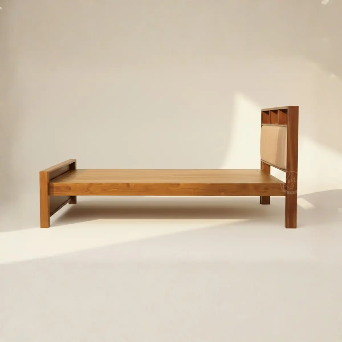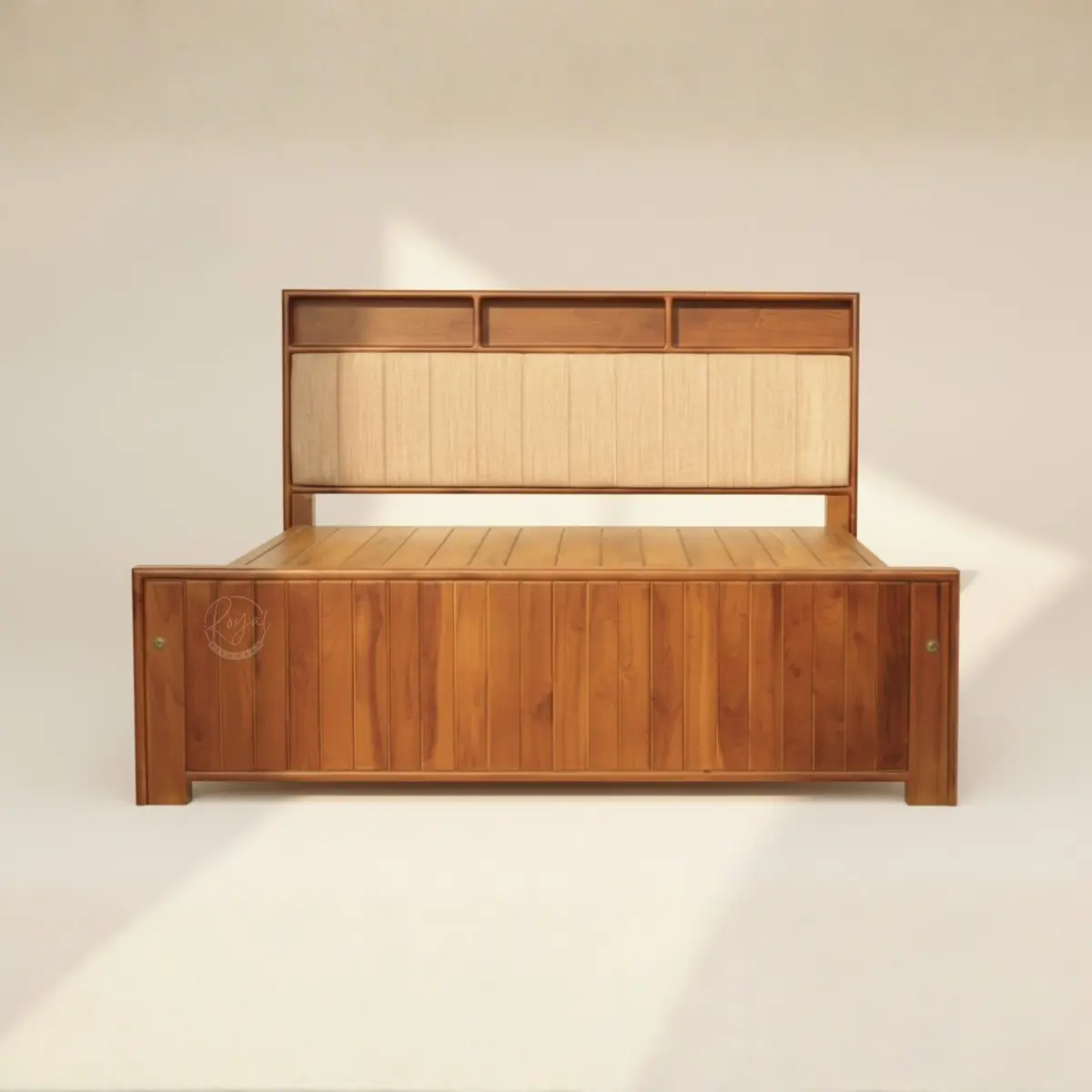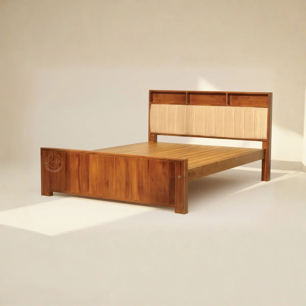 Wooden cot that redefines modern bedroom functionality—introducing the Royal Elyon. This contemporary wooden cot features an innovative storage headboard with open shelf compartments, plush vertical-channel upholstered backrest, and striking vertical slat footboard. Handcrafted from premium Nilambur teak with warm golden tones and substantial solid construction. Perfect for modern bedrooms seeking furniture that combines intelligent storage solutions with sophisticated design through expert craftsmanship and quality materials.