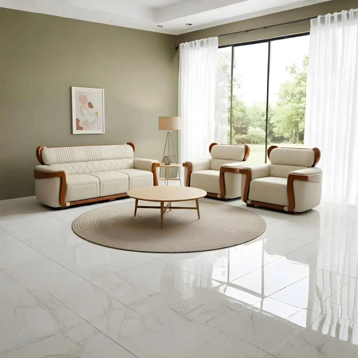 The upholstery is built to last. The fabric can handle regular family use, and the channel-tufting helps hide minor wear patterns that develop over time. This is a wooden sofa set designed for real living, not just looking impressive in photos.