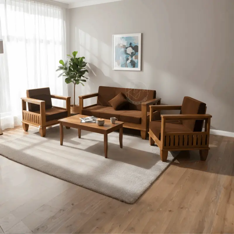 The neutral palette and refined design of this wooden sofa set for a living room create versatile foundations for various approaches to decoration. Warm teak tones and sophisticated taupe upholstery complement virtually any color scheme, from earthy naturals to bold jewel tones. This adaptability means your wood-framed sofa enhances multiple decorating styles without requiring commitment to a single aesthetic permanently.